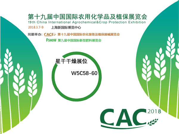 星干干燥將于3月7-9日參加在上海新國際博覽中心(上海浦東新區(qū)龍陽路2345號(hào))舉辦的“第十九屆中國國際農(nóng)用化學(xué)品及植保展覽會(huì)(CAC2018)”。在此,感謝新老客戶多年來對(duì)星干干燥的支持,星干展位號(hào)是:W5C58-60,歡迎各位前來參觀洽談合作。